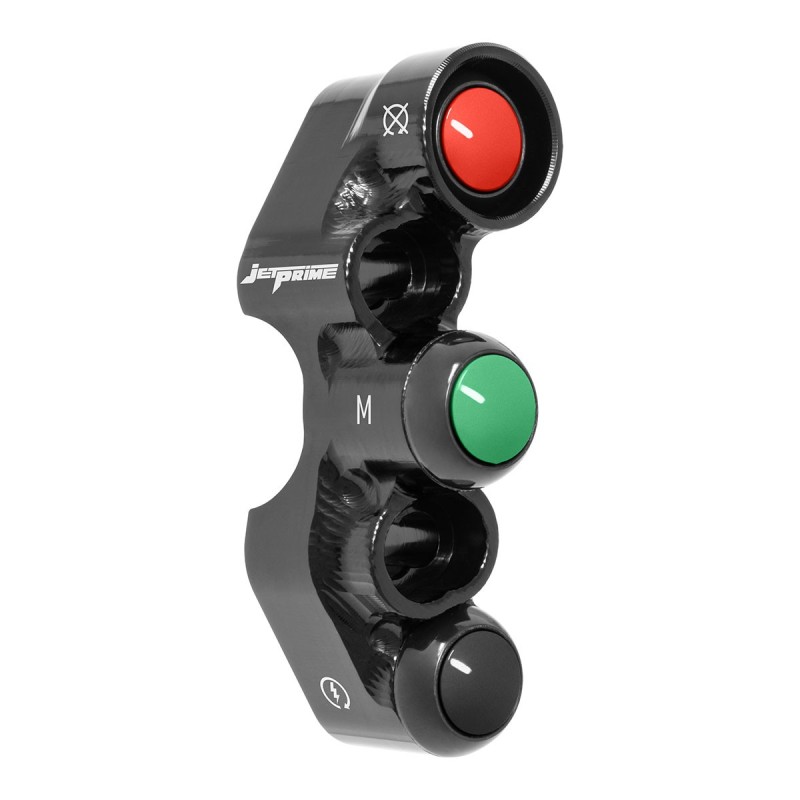 Die Jetprime Lenkerschalter werden vollständig aus dem Vollen aus Ergal 7075 mittels CNC gefertigt, einem Material, das maximale mechanische Festigkeit, geringes Gewicht und lange Lebensdauer gewährleistet. Die verwendeten Taster/Schalter entsprechen militärischer Spezifikation und gewährleisten hohe Betriebssicherheit sowie Schutz vor äußeren Einflüssen wie Wasser, Staub und Vibrationen, selbst unter anspruchsvollen Einsatzbedingungen.