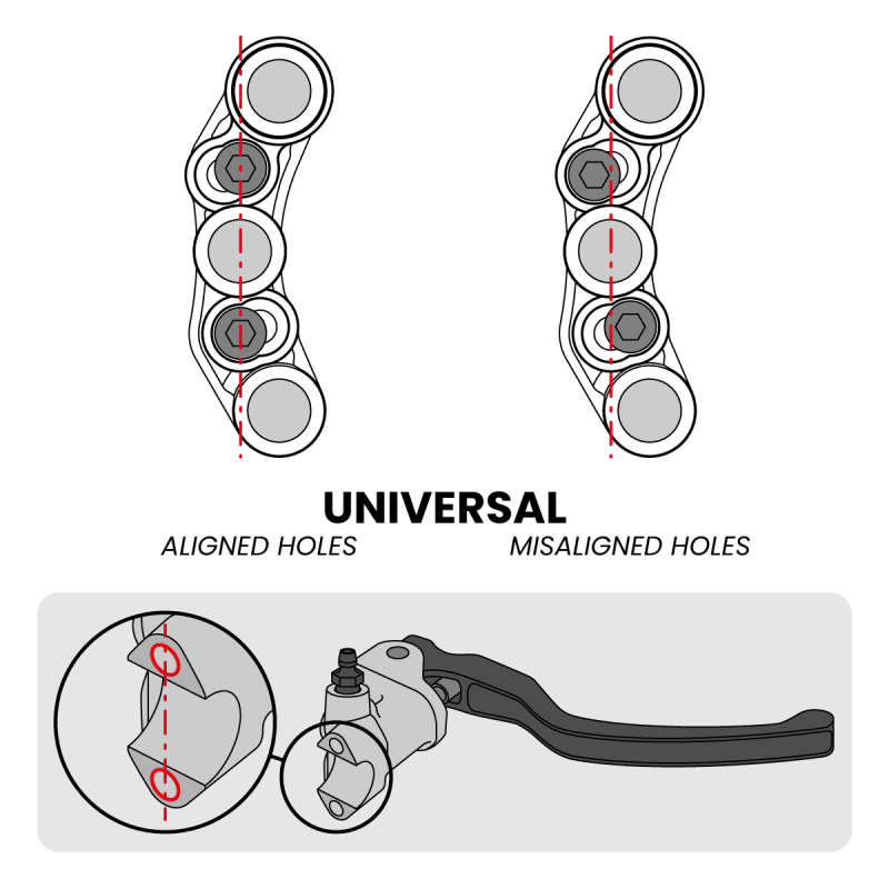 REMARQUE: ce commodo de guidon est conçu pour être monté sur le maître-cylindre de frein à la place du collier d'origine. Il dispose d’un perçage universel permettant l’installation sur les maîtres-cylindres avec des trous de fixation alignés ou désalignés.